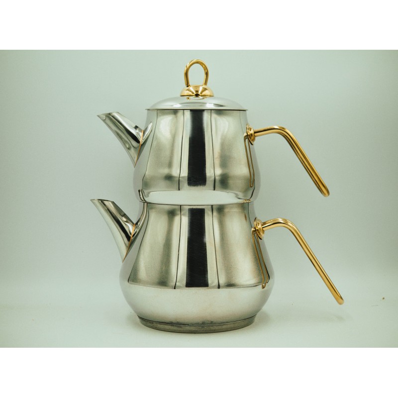 Podwójny czajnik do parzenia herbaty tureckiej ze złotymi wstawkami.